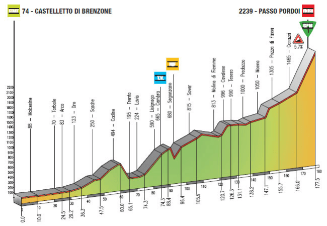 El Giro del Trentino 2012 se despide con la etapa más larga de la carrera (aunque no pasa de tener un kilometraje medio), uniendo la localidad de Castelleto di Brenzone, a las orillas del Lago di Garda, y la cima del Passo Pordoi: uno de los puertos más transitados históricamente por el Giro de Italia, lo que le ha elevado a la categoría de mítico pese a no tener mucha dureza … aunque si altitud, superando los 2.200 metros.