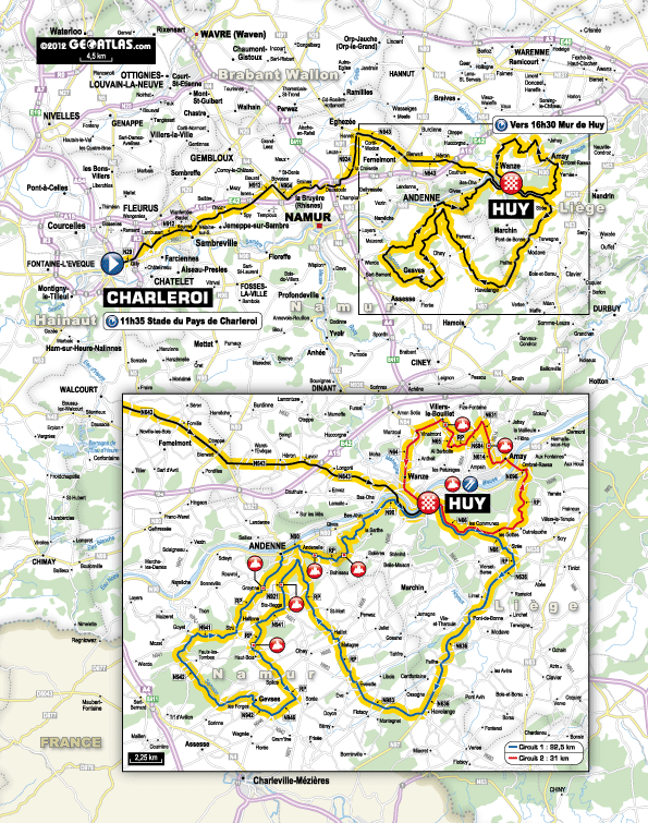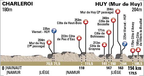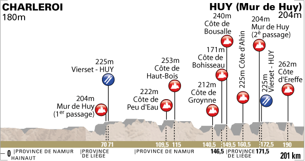 - Mur de Huy (km 204): 1.3 km – 9.3 %