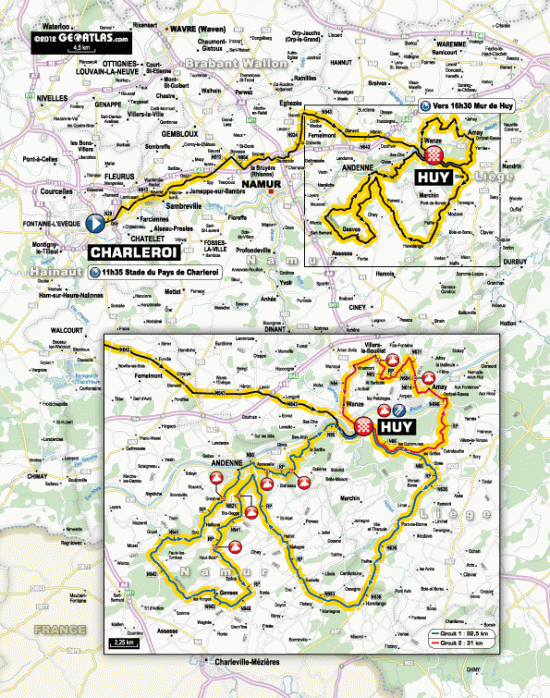 Parece que los organizadores tomaron nota de ese mal resultado en 2011 porque este año de nuevo se cambia el recorrido. Se recorta el kilometraje de la parte intermedia, eliminando la cota de Ahin y quedando una distancia total de 194 km, pero a cambio se añaden 2 nuevas cotas en el circuito final: Amay y Villers-le Bouillet, no excesivamente duras pero sí muy bien encadenadas, que sustituyen a la cota de Ereffe. Después de coronar la segunda, una cómoda bajada hasta la ciuda de de Huy dejará a los ciclistas al pie del Muro.