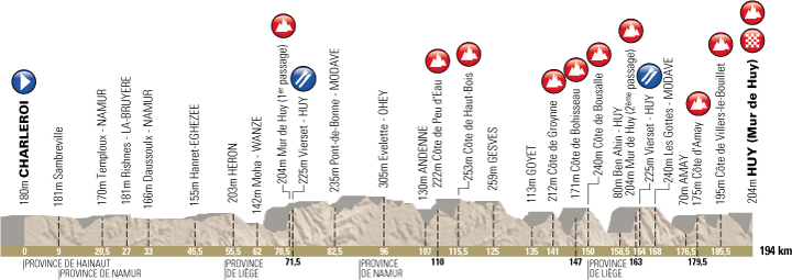 - Mur de Huy (km 163): 1.3 km – 9.3 %