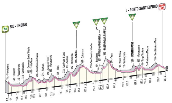 -Pero además, la etapa no finaliza en la entrada a Porto Sant Elpidio, sino que se da un rodeo por los alrededores de la localidad, alejando los puertos 12 km de meta y perjudicando posibles ataques previos.