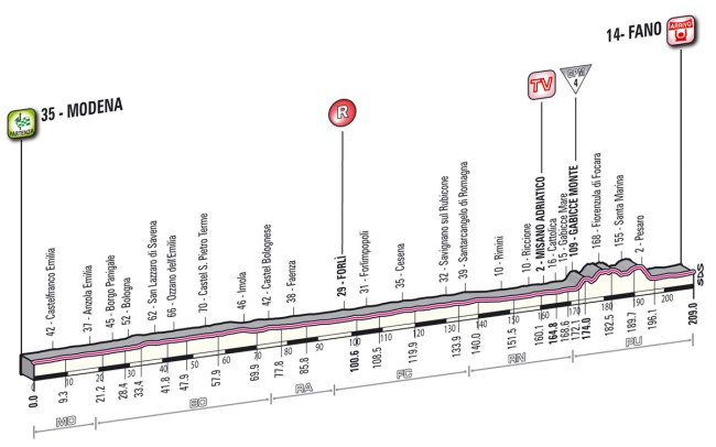Etapa absolutamente rectilínea, que va desde Modena hasta Fano, junto al Mar Adriático, atravesando importantes localidades como Bologna, Rimini y Pesaro. Entre estas dos últimas se atraviesan una serie de repechos, el primero de ellos puntuado de 4ª categoría, que pueden aportar algo de emoción al desarrollo de la etapa, aunque tras ellos restarán aún 13 km totalmente llanos hasta la línea de meta, por lo que parece una etapa muy favorable para los velocistas, la 3ª en lo que va de carrera.