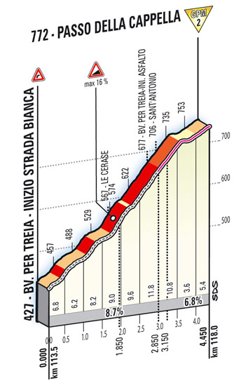 El primer tercio del recorrido es muy quebrado, propicio para la formación de fugas y con varias cotas que podrían haber puntuado perfectamente para la clasificación de la montaña. Ya en la parte central los corredores tendrán que superar el encadenado de Staffolo + Cingoli, este último marcado de 3ª categoría con casi 9 km al 5,8 % de media, antes de encontrarse con la trampa de sterrato de este Giro, en la dura ascensión al Passo della Capella, que aunque quede lejos de meta debería crear una primera selección. La subida tiene rampas muy duras, con puntas de hasta el 16 % y 2 km centrales a más del 10 %, lo que unido a su superficie sin asfaltar (salvo el inicio y final de la ascensión) la convierten en un puerto muy serio.