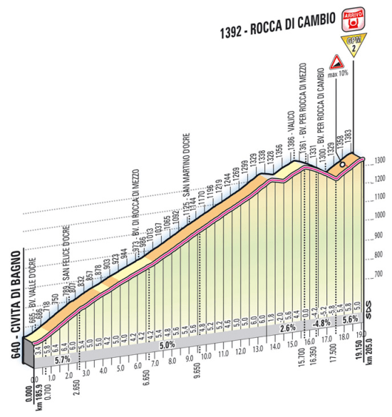 El Giro suele programar unos primeros contactos con la montaña suaves y al igual que Montevergine, un clásico de los últimos años, Rocca di Cambio es un puerto largo y tendido, algo más corto que aquel pero rondando casi siempre la misma media del 5 %, con unas cifras totales de 15,7 km al 4,8 % y sin un solo km que se acerque al 7%, siendo a priori una ascensión más favorable para corredores potentes que para auténticos escaladores.