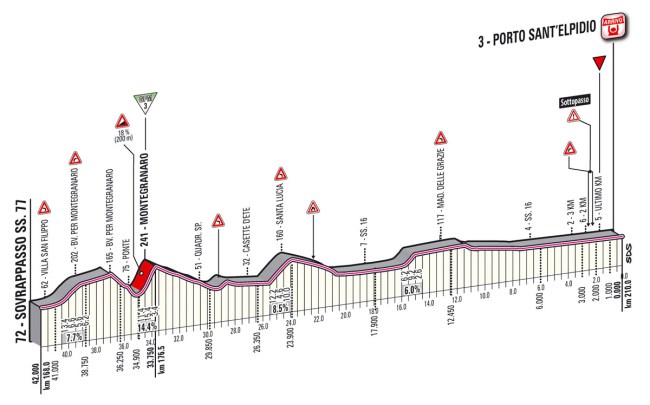Los últimos 42 km, con varias cotas, incluyendo el muro de Montegranaro, pero una parte final llana.