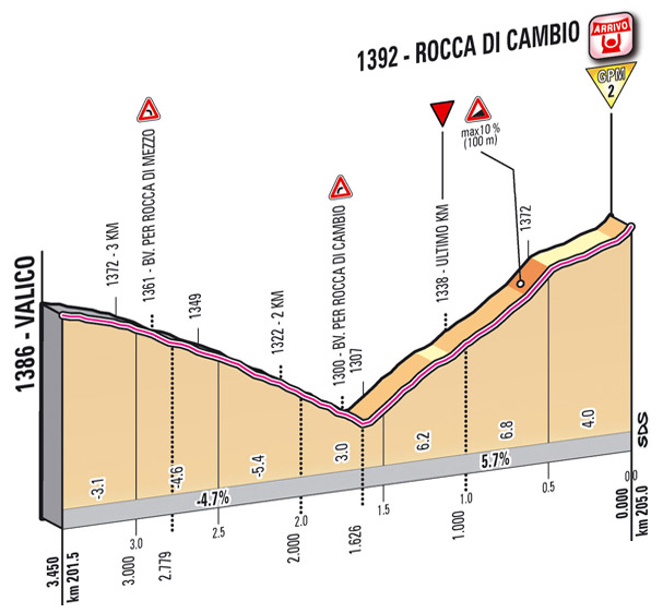 Será la 4ª ocasión en que Rocca di Cambio albergue un final de etapa, aunque ya hacía más de 30 años desde el último antecedente, en 1968, de grato recuerdo para el ciclismo español gracias a la victoria de Luis Pedro Santamarina mediante una escapada lejana.