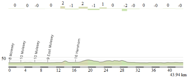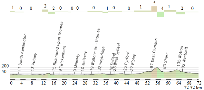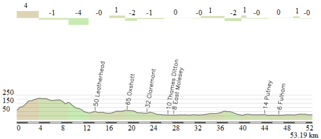 La salida se realiza en dirección al Hyde Park corner, pasando junto al Buckingham Palace; posteriormente la carrera cruza el río Thames y se interna en el condado de Surrey encarando en East Clandon la única dificultad montañosa antes el circuito de Box Hill. Se trata de la subida a Staplelane Copse, de unos 2 km al 5 % de pendiente media, con alguna rampa de dos dígitos escondida en su comienzo.