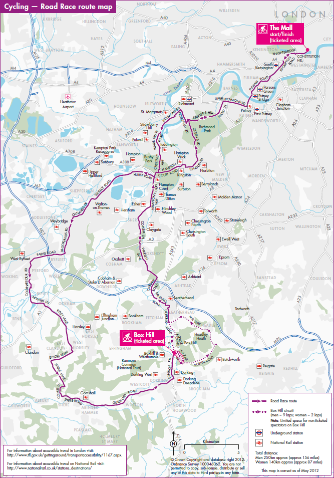 Por su parte, la prueba femenina tendrá un trazado idéntico, con la excepción de que el número de vueltas a Box Hill será de 2 en vez de 9, para un kilometraje total de 140 km.