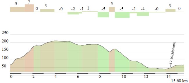 Superada la rampa más dura aún quedará un terreno ligeramente ascendente, de alrededor de 1 km que añadirá algo más de dificultad a la subida. Una vez terminado, la carrera volverá a pasar de los 200 metros de altitud a los alrededor de 50 m habituales en el resto del trazado. Pero antes de que finalice el circuito hay otras dos pequeñas ascensiones, mucho más cortas y tendidas que Box Hill, de unos 200 m cada una, que añadirán más de dureza al circuito.