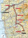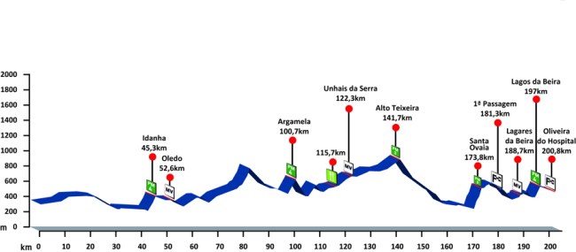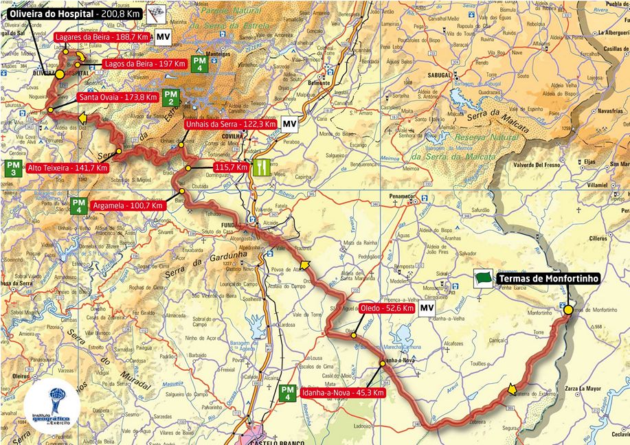 1ª ETAPA (Jueves 16 agosto): TERMAS DE MONFORTINHO – OLIVEIRA DO HOSPITAL (200,8 km). Rutómetro / Perfil últimos km / Mapa salida – llegada