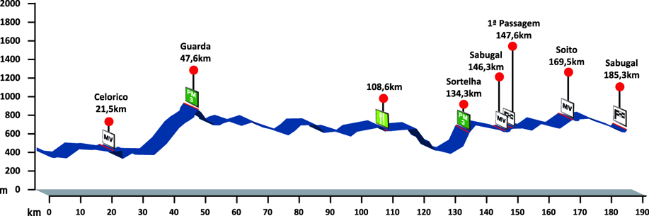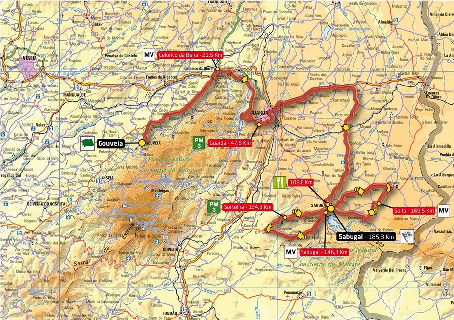 7ª ETAPA (Miércoles 22 agosto): GOUVEIA – SABUGAL (185,3 km). Rutómetro / Perfil últimos km / Mapa salida – llegada