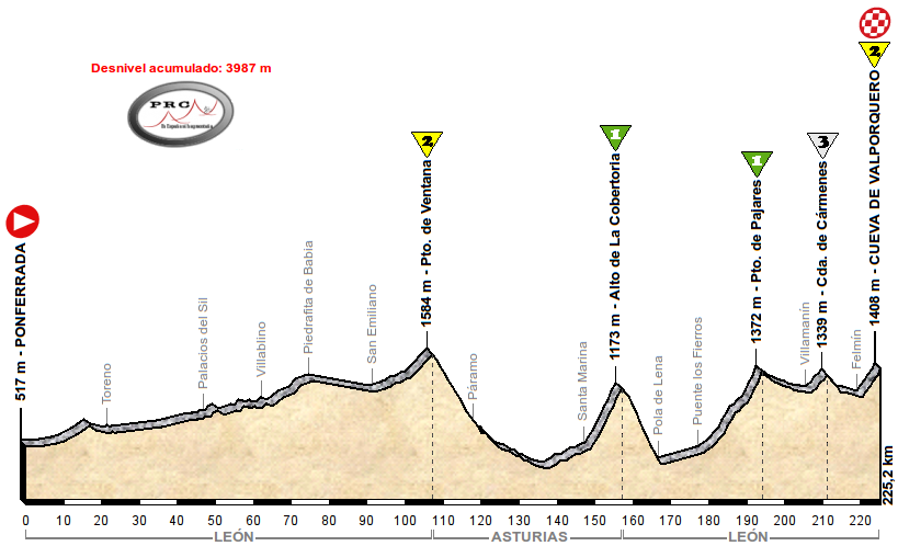 Tras su técnico descenso y los falsos llanos por Campomanes, llega el puerto clave del día, Pajares. Sus rampas, ya de por sí duras, se harán más exigentes al llegar después de 3 puertos, y con su cima a 31 km de la llegada se sitúa a una distancia ideal para poder ver ataques en él, seguidos de bonitas persecuciones entre grupillos en el terreno posterior.