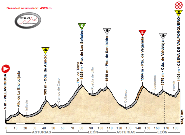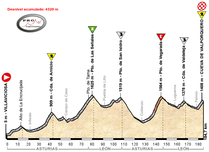 Ahí la carretera comienza a ascender, primero suavemente para acabar con las tremendas rampas del Puerto de Vegarada. Con su cima a 38,6 km de meta, sus tremendas rampas y el piso de tierra deberían dejar un pelotón reducidísimo con solo los favoritos, facilitando buscar las debilidades del rival y ganar un buen tiempo en la meta