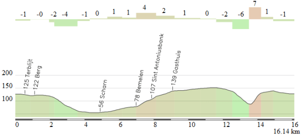 Ninguna de las cotas es demasiado dura (aunque Rugweg y Eperheide si son relativamente largas, superando los 2 km de longitud), pero la continuidad entre ellas a partir del km 60 hará daño en caso de que el ritmo sea elevado, siendo un terreno difícil de controlar por parte del pelotón y donde se pueden producir múltiples intentos de fuga.