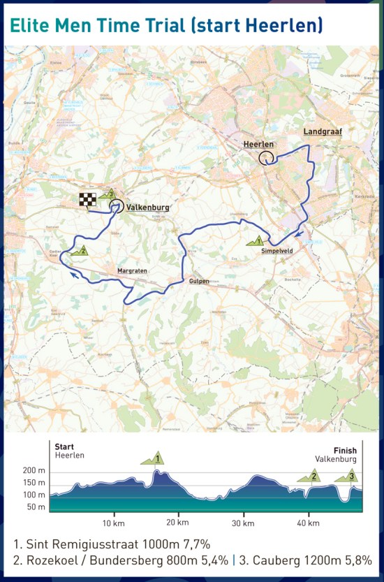 El recorrido de la prueba contrarreloj de este año, que unirá las localidades de Heerlen y Valkenburg, en el sureste de Holanda, es algo más duro de lo habitual en los Mundiales, contando con varios repechos, incluyendo uno no puntuable a mitad de trazado, y una distancia total de 46 km.