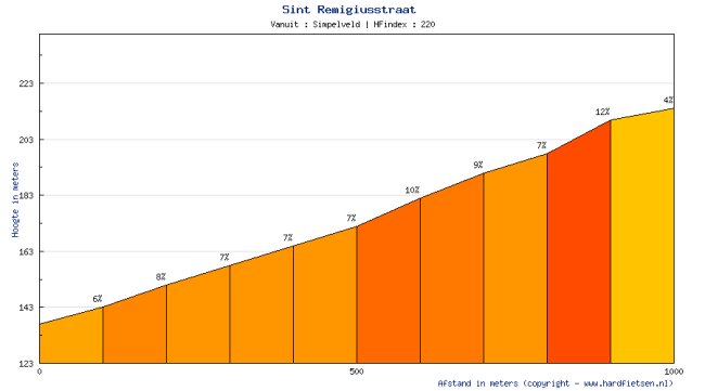 Los primeros 10-12 km, a excepción de la salida «ratonera», son bastante sencillos (aunque los corredores deberán dosificarse para no pagarlo al final), pero pasado ese tramo y tras una zona de carretera estrecha tendrán que afrontar la dura cota de Sint Remigiusstraat, con 1 km al 7,7 % y rampas máximas que superan claramente el 10 %, cortando el ritmo a los corredores.