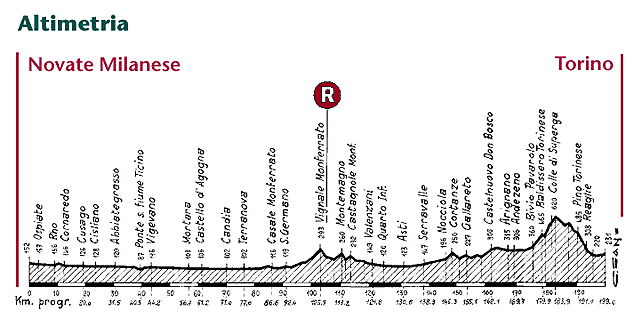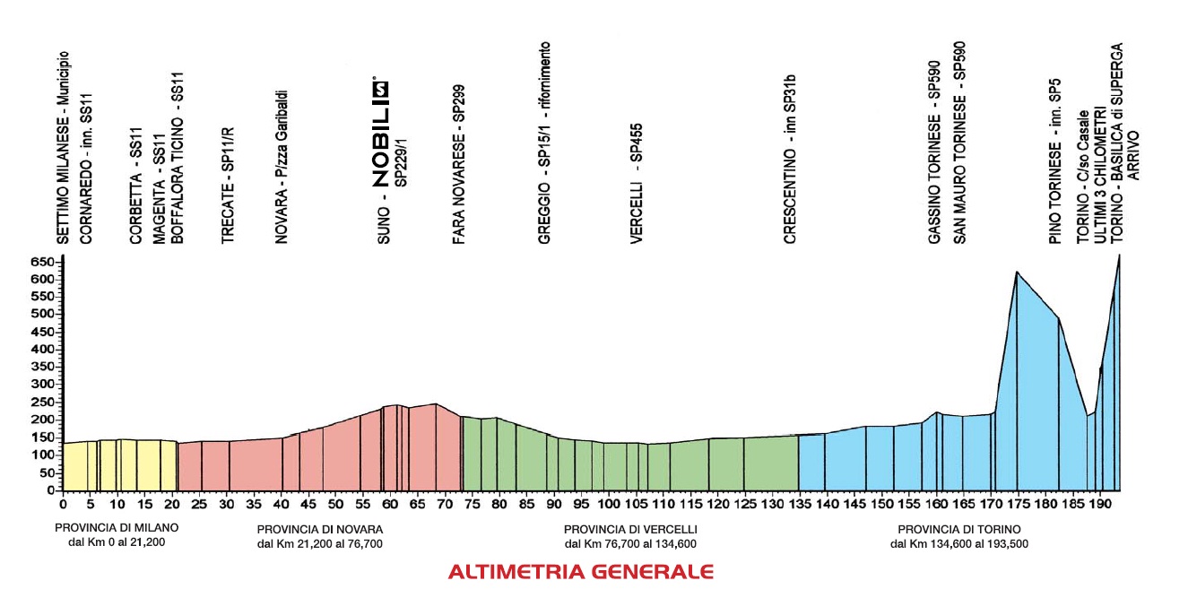 Los primeros 170 km, atravesando las provincias de Milán, Novara, Vercelli y Turín, no tienen ninguna dificultad orográfica reseñable, pero al llegar a los alrededores de Turín la ruta se complica con subida al Colle di Superga: alrededor de 4 km al 10 % de media y con largos tramos sostenidos por encima del 12 %. Un buen lugar para que haya ataques y se seleccione el pelotón, además de reducir diferencias con la posible escapada.
