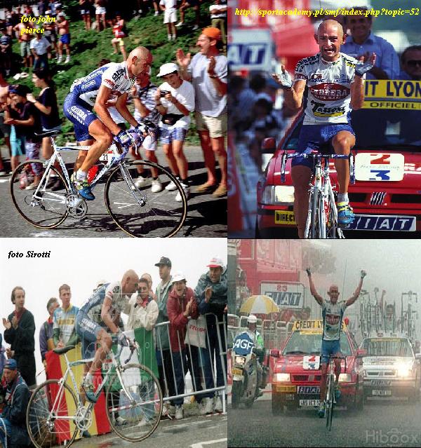 Ya poco importaba que Zanini ganara por delante el sprint a hombres como Casagrande, Gianetti, Nardello o Rolf Sorensen, el cual acababa 2º. El drama se vivía en plena bajada unos kilómetros antes: Dell´Oglio se fracturaba el fémur y Pantani se destrozaba la tibia y el peroné. Aunque la prensa decía que podría estar recuperado en 3 ó 4 meses, Marco sabía que su vida ciclística corría peligro y que no podía dejar huérfanos a todos los tiffossi que le admiraban. Estuvo en blanco todo el año 1996, para terminar marchándose del equipo Carrera al Mercatone en la temporada 1997, donde la mala suerte, en este caso en forma de gato negro, se le cruzaba durante el Giro de Italia, sufriendo una caída que era otro revés mas para el Pirata, viéndose obligado a abandonar en un Giro donde tenía muchas esperanzas. No fue hasta el Tour cuando pudo por fin resarcirse, en Alpe d´Huez, el lugar que Coppi había hecho mítico en el 52, y que el propio Marco había enmarcado en el 95.
