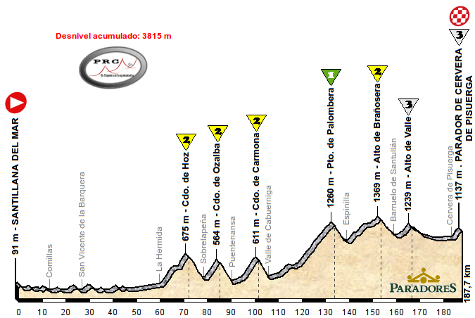 La primera es una etapa en línea completa que sale de Santillana del Mar, localidad que cuenta hasta  con 2 Paradores. Durante los primeros 40 km se recorre la costa pasando por Comillas y San Vicente de la Barquera, para entonces girar al interior y comenzar la sucesión de puertos al llegar a La Hermida con los famosos tres collados: Hoz, Ozalba y Carmona. Poco después llega el único puerto de primera del día, el de Palombera. Se subió por última vez en La Vuelta en 2007 camino de Reinosa, y destaca por su longitud (22 km) y sus tendidas rampas (4,3% de media). Tras una ligera bajada llega el Alto de Brañosera, muy irregular alternando zonas de falso llano con zonas al 6% aprox. Se remata este encadenado con el Alto del Valle, de 4,9 km al 4,5%, cuya mayor dificultad y atractivo es su estrecha y botosa carretera. Se corona a 21 km de la llegada, que constan primero de una suave bajada, luego un tramo llano por buena carretera y la ascensión final al Parador de 2,9 km al 5%.