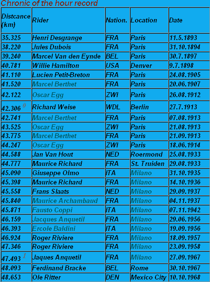gran historiá, pero el record de la hora debe servir también para recordar a 3 grandes ciclistas: Fausto Coppi (que sin ser contrarrelojista puro tenía tanta clase que consiguió este record, gano cronos y hasta una Paris-Roubaix), Roger Riviere, en mi opinión entre los 3 mejores ciclistas franceses de todos los tiempos; y por último Graeme Obree que fabrico su propia bicicleta usando los cojinetes de una lavadora y además de 2 record fue doble campeón del Mundo de persecución.