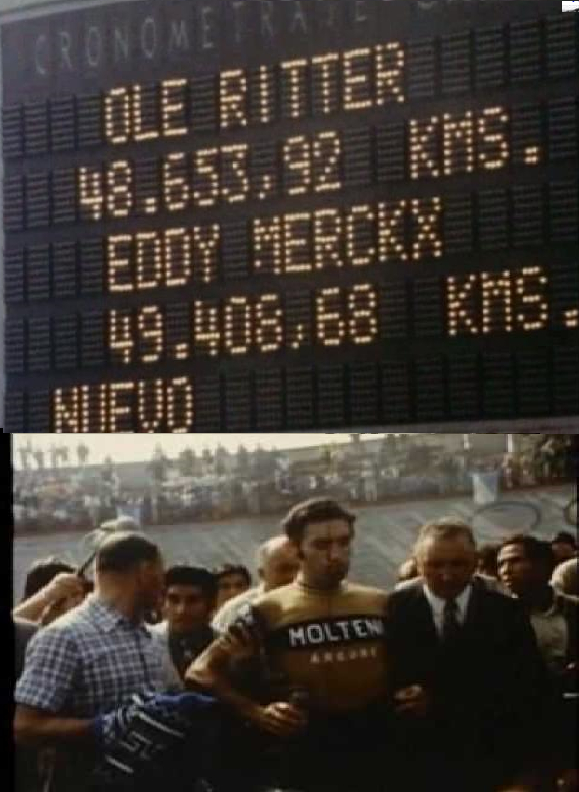 Con 1 minuto 9 segundos y 97 centésimas para el primer kilómetro, estaba en tiempo de batir el record de la disciplina, aunque siendo quizás un inicio demasiado rápido para una prueba tan dura. Seguía forzando y hacía el segundo kilómetro en 1 minuto y 9,84 segundos, a ritmo de superar a Ritter en la primera referencia del kilómetro 5, donde el danés hizo 6’10». Efectivamente, en el primer punto de referencia, kilómetro 5, Merckx marcaba 5’55», superando ya a Ritter en 15 segundos, unos 200 metros.