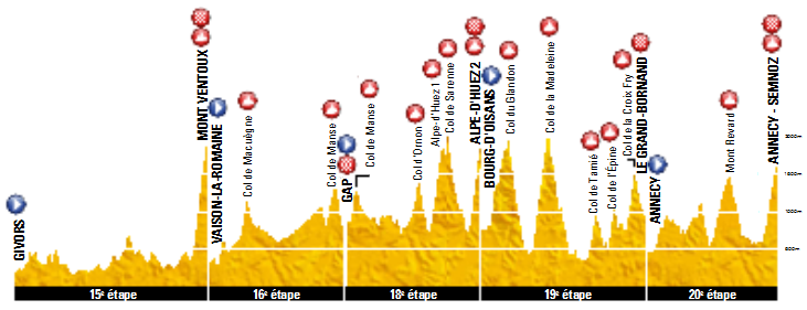 Superada la última jornada de descanso, la 3ª semana se inicia con una etapa de media montaña con final en Gap, con sólo 2 puertos puntuables, Macuégne y Manse, pero el último a menos de 15 km de meta, la mayoría de bajada. Aunque su recorrido no está confirmado, parece que los 60 km finales serán idénticos a los de la etapa de 2011 -> clasificación / vídeo, con victoria de Hushovd por delante de Boasson Hagen, ambos integrantes de la fuga del día, y mucho movimiento de los favoritos, con un ataque de Contador en Manse al que dio continuidad Evans en la bajada. Al día siguiente, en la etapa 17ª, se disputará la 2ª crono individual, uniendo las localidades de Embrun y Chorges. La distancia es similar a la de la contrarreloj de Mont St. Michel, 32 km, pero en este caso el trazado es más duro, incluyendo los puertos de Puy Sanières y Saint Apollinaire (hasta el cruce del km 8,2 + otros 3 km de «cresteo») y sin apenas terreno llano -> posible ruta, siendo más favorable para los corredores completos y que lleguen en un buen estado de forma que para los rodadores.