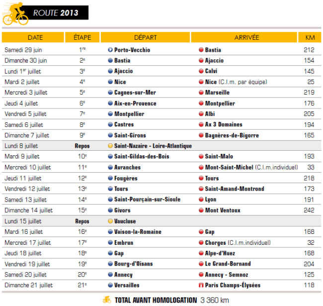 Comparado con el recorrido del Tour 2012, y más allá de la novedosa salida desde Córcega, hay 2 aspectos que llaman mucho la atención: aumento en la dureza de los finales en alto, con 3 llegadas en subidas “Hors Categorie” (Mont Ventoux, Alpe d´Huez y Semnoz), aunque no así en el global del recorrido como se está insistiendo desde muchos medios de comunicación; y reducción de km de crono individual, pasando de 101 a 65, la mitad de ellos de una CRI que no tiene casi llano, si bien es cierto que también hay una CRE (aunque muy corta). Estos 2 aspectos ya habían sido los más novedosos de 2012 … pero en sentido contrario, al reducir la dureza y nº de llegadas en alto y aumentar los km de CRI respecto a ediciones anteriores. Sin embargo, tampoco es un regreso a 2011, donde sólo había un crono larga y todas las etapas decisivas estaban en los 10 últimos días; ni a 2010, donde la dureza radicaba más en los puertos de paso y en la abundante media montaña que en los finales, habiendo también sólo una CRI.