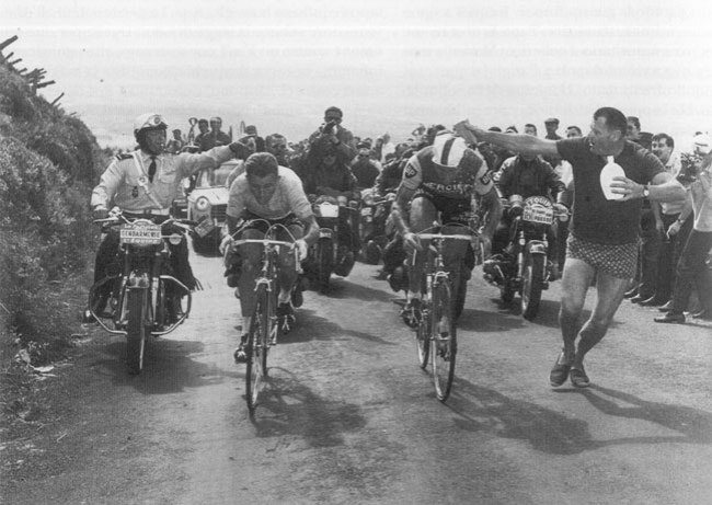 Era épico, histórico, un enfrentamiento que al igual que los de Coppi y Bartali pasaría a la historia del ciclismo. En el dúo delantero se destacaba Jiménez, que conseguía sacar unos metros a Bahamontes. Mientras tanto parecía que los dos franceses acabarían juntos la etapa … pero Anquetil hizo crack, faltaba un kilómetro y «Pou Pou« veía que el Tour podía ser suyo. Forzaba, se retorcía, sufría como nunca para aumentar el hueco sobre Anquetil. Por delante Jiménez cruzaba la meta en primer lugar, Bahamontes 2º y Poulidor tomaba la última curva para llegar a 57″ de Jiménez. De cara a la general esa pérdida daba igual, lo importante eran los 56 los segundos debía recuperar Poulidor sobre Anquetil para alcanzar el ldierato. Pasaban unos segundos eternos , aparecía Adorni y tras él Anquetil, 35″, 36″, 37″ … y a 42″ de Poulidor un Anquetil hundido físicamente como nunca antes cruzaba la meta. Sus primeras palabras eran para Geminiani, » ¿Cuánto?», » 14 segundos», » Perfecto, me sobran 13″.