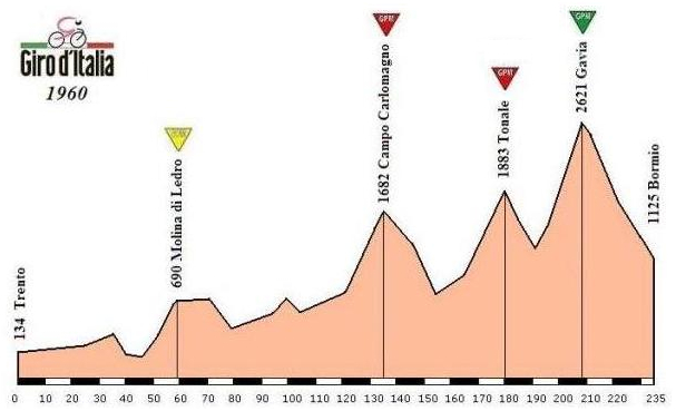 En el año 1960 el reto de Anquetil cambió, centrando en ser el primer francés en ganar el Giro … y lo consiguió. Tras una primera parte de la carrera en la que se había llegado a poner de rosa, el normando esperó a la crono de la 16ª etapa en Lecco, de 68 kilómetros, para abrir hueco respecto a sus rivales, doblando a Gaul y metiendo grandes diferenciasen la general, dejando a Nencini a casi 4 minutos y a Gaul a más de 7. Sólo quedaba una etapa que pudiera causar verdadero temor a Anquetil, la penúltima, con 229 kilómetros entre Trento y Bormio y los puertos de Molina di Ledro, Campo Carlo Magno, Passo del Tonale y Passo di Gavia. Era el día elegido por Gaul y el luxemburgués no decepcionó: atacó con todo en el Gavia y ganó la etapa, pero sin embargo no pudo enjugar los más de 7 minutos que tenía de desventaja con Anquetil y los más de 3 con Nencini. No obstante, el líder sufrió ante el italiano, que aprovechando sus habilidades en el descenso y los muchos problemas mecánicos que padeció el francés llegaba a meta con bastante ventaja. Le faltaron sólo 28 segundos. Anquetil y Francia tenían su primer Giro.