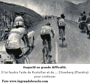 En ese momento Anquetil, al que su director Geminiani no paraba de arengar, recibía, según cuentan las crónicas, un bidón con champán que le hacía recobrar el pulso. La desventaja era grande pero el normando era un gran bajador. Y Anquetil se olvidó de la maldición … aunque casi la cumple: se jugó la vida en cada curva, arriesgó en cada metro de bajada y cuando terminó el largo descenso ya había cazado al grupo del líder y estaba sólo 1’30» del grupo de Poulidor. Fué una persecución grandiosa, con las ventajas oscilando entre los 50″ y el minuto y medio. Pese a las dificultades sufridas, el Tour no estaba perdido para Anquetil. Finalmente se producía la fusión, pero la etapa aún no había acabado: un desgraciado Poulidor pinchaba, y cuando le cambiaban la rueda para incorporarse su mecánico lo tiraba al suelo. La maldición afectaba a Pou Pou, perdía comba y entraba en Toulouse en un segundo grupo, a 2’36» del grupo de los mejores. Groussard seguía lider pero todo hacía preveer que Anquetil le quitaría el liderato en breve.