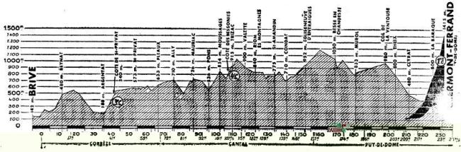 Se salía de Brive para recorrer casi 240 kilómetros, con dos estrategias muy claras: la del equipo Mercier de frenar las escapadas a fin de conseguir las bonificaciones en meta (1′ al primero y 30″ para el 2º), y la del equipo de Anquetil, al cual le iban bien los escarceos por la etapa. Unas 500.000 personas esperaban a los ciclistas en el Puy de Dôme. Sin embargo casi de salida se formaba una fuga peligrosa con Grousard, sí, nuevamente el francés, que provocaba que el Mercier tuviera que tirar del grupo, anulando definitivamente la fuga al pie del volcán.