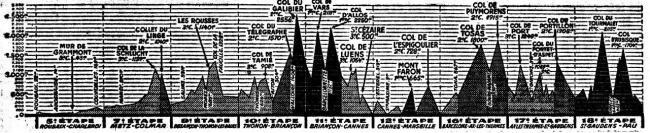 La carrera empezó en Rennes el 22 de Junio, con el Saint Raphael de Anquetil y el Mercier de Poulidor en medio de los focos, pero sin olvidarnos de los españoles, de Anglade o Janssen. Las primeras etapas servían para escapadas, siendo el francés Georges Groussard el máximo beneficiado, ya que ganaba 4 minutos a los corredores importantes y se colocaba cerca del liderato. Parecía que Anquetil estaba acusando los esfuerzos del Giro, y en estas llegaban los Alpes. La 1ª etapa partía de Thonon Les Bains, camino de Briancon en un maratón de casi 250 km, afrontándose en la parte final el Galibier norte (el mismo recorrido que en la jornada de 1957 donde Anquetil alcanzó el liderato). Bahamontes aprovecha la etapa para colocarse 2º en la general, tras protagonizar una gran subida al Galibier e imponerse en Briancon, mientras que Anquetil sufre pero contacta con Poulidor en el descenso. Finalmente pierde unos segundos valiosos por un pinchazo y Poulidor acaba 2º la etapa. Nuevo líder, Groussard. Otro rival más.