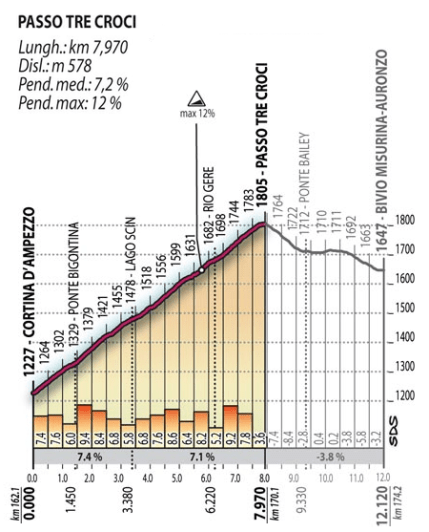 Terminada la ascensión, a 39 km de meta, fuerte descenso hasta llegar a la localidad de Cortina d´Ampezzo, que fue la llegada de la etapa 17ª del Giro 2012, con victoria para Joaquim Rodríguez, y donde sin prácticamente llano comenzará la subida al Passo Tre Croci, con 8 km al 7,2 % de media y rampas máximas del 12 %. Una vez coronado, a casi 14 km de la línea de meta, habrá 4 km de descenso, aunque muy irregulares (incluyendo un tramo llano intermedio), antes de iniciar la ascensión a Tre Cime di Lavaredo, con un primer km relativamente duro pero llaneando a la altura de Misurina, afrontando a continuación el «muro» del lago Antorno: 1 km al 12 % y rampas del 18 %. Coronado este primer altillo y tras una suave bajada se reanuda la subida en busca del refugio Auronzo, con 4 km finales al 12 % y de nuevo con puntas cercanas al 20 %, lo que unido al desgaste acumulado durante la etapa y las jornadas previas puede suponer una auténtica pared para los corredores -> encadenado Tre Croci + Tre Cime.