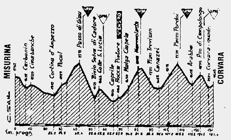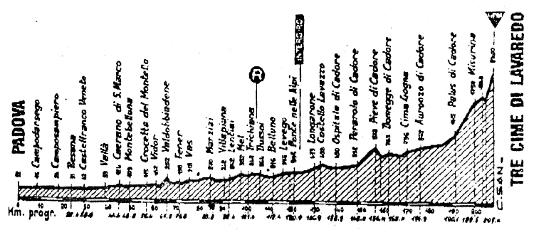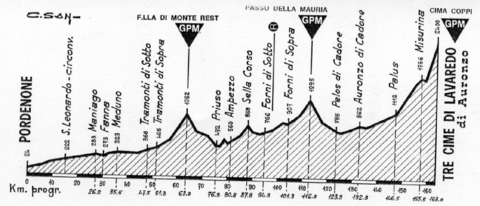 Volviendo a las primeras etapas con esta ascensión, tanto en 1967 como en 1968 el recorrido tenía 213 km, con salida en Gorizia y llegada en Tre Cime (por la vertiente de Auronzo) tras superar el Passo Saint Osvaldo y la tendida subida a Pieve di Cadore, habiendo algo más de 30 km de falsos llanos antes de la ascensión final, por la vertiente de Auronzo.