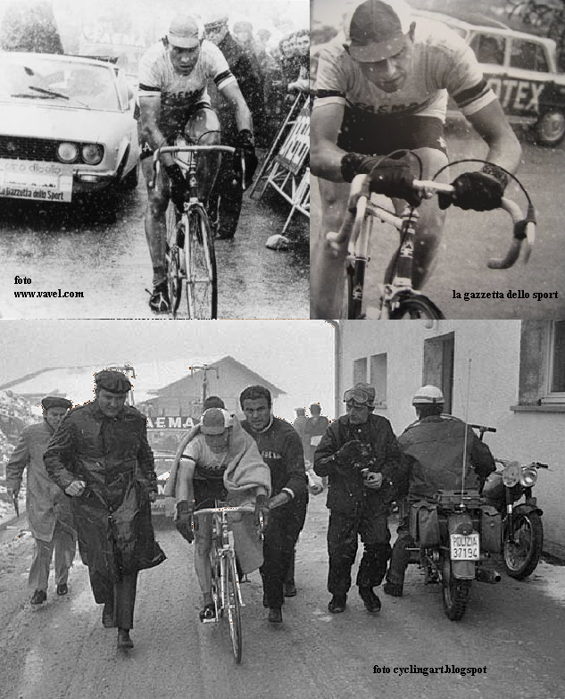 En el 67, Gimondi ganaba bajo la nieve y por delante de un jovencísimo Merckx -> vídeo, una etapa que después era anulada debido a irregularidades y empujones por parte de los aficionados, provocando un gran enfado en el ciclista italiano. Finalmente Gimondi se alzaba con el primero de sus 3 Giros, quedando también para la historia que fue la última gran vuelta de Jacques Anquetil, acabando 3º tras haber sido líder a 2 días del final y perder la maglia en la jornada de Tirano.