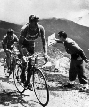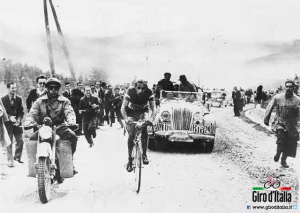 En ese momento el periodista Mario Ferreti interrumpía la emisión radiofónica de la RAI para expresar más que una noticia, un sentimiento, una frase que pasaría a la historia del ciclismo:  «un uomo solo e al comando; la sua maglia e bianco-celeste; il suo nome e Fausto Coppi». Los tiffosi abandonaban sus casas, querían ver al fraile volador en el Izoard, en Sestriere o donde fuera. Las carreteras estaban atestadas con aficionados enloquecidos que animaban al campeón italiano. Cuentan las crónicas que algunos de ellos barrían la carretera para evitar posibles pinchazos, mientras que otros se arrodillaban a su paso, llorando y gritando su nombre.