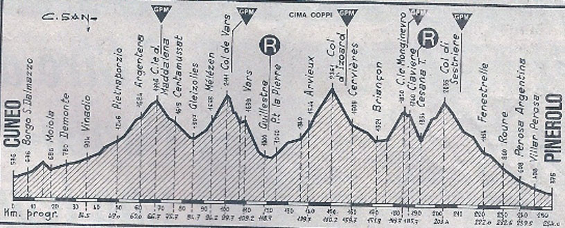 El día amaneció frío y húmedo, con la carretera de la Maddalena enfangada. A pesar de ello Coppi no iba a tardar mucho en demostrar que éste era su día: viendo a su rival Bartali mal colocado en el grupo, al parecer por problemas en los frenos, atacó durante la subida para no parar ya hasta meta. Quedaban más de 190 kilómetros para el final, pero nada importaba, estaba decidido: era la jornada para ser recordado por la historia.