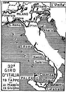 El mapa del Giro 1949. Imagen Ilciclismo.it
