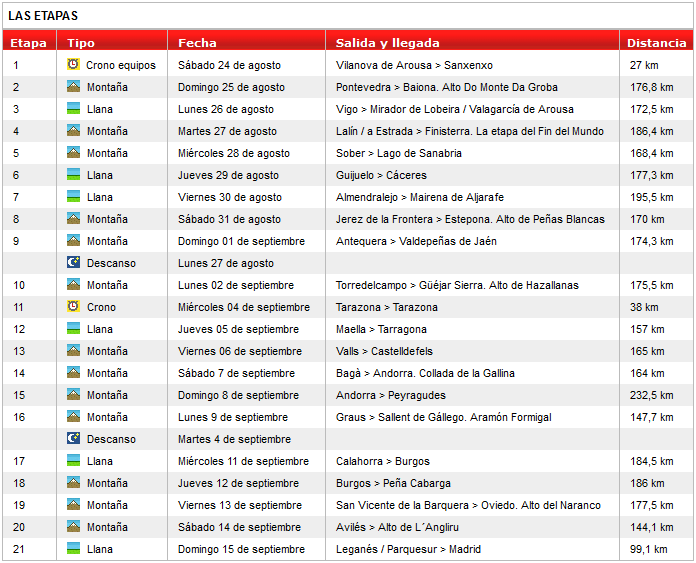 *Las fechas de los descansos están mal: el 1º será el martes 3, después de la etapa de Haza Llana, y el 2º el martes 10.