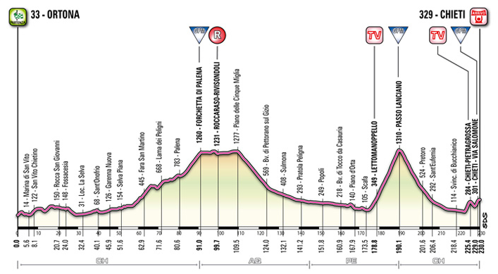 Al día siguiente, nueva etapa de montaña, en este caso con un kilometraje muy elevado y destacando el durísimo Passo Lanciano, con 15 km al 7,9 % de media y largos tramos a más del 10 % -> perfil detallado (no incluye el inicio). Después de coronar, a 40 km de meta, largo descenso seguido por una zona más o menos llana de 16 km (aunque los primeros 6 con tendencia favorable) antes del doble muro final en Chieti: Pietragrossa por Via Fieramosca, con 2 km iniciales al 9%; y Via Salomone por Tricalle (últimos 2 km del perfil), con la meta en Corsa Marruccino al igual que en las etapas de 2011 y 2012. Cabe señalar que estas 2 subidas también estarán presentes en el Giro de Italia 2013, en la etapa con final en Pescara (7ª), aunque situadas a unos 40 km de meta.