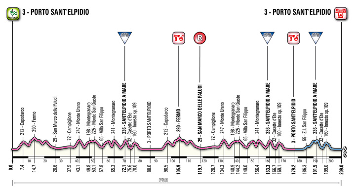 El penúltimo día de carrera llegará una etapa sin grandes puertos pero con un trazado muy duro, un auténtico «serrucho» de más de 200 km en torno a Porto Sant´Elpidio, incluyendo 3 pasos por la línea de meta merced a un primer bucle largo que se hará en 2 ocasiones y un circuito final de 30 km. Durante la ruta los corredores tendrán que superar multitud de pequeñas cotas y repechos, destacando la secuencia de Monte Urano, Monte San Giusto, Luminaro, Montegranaro (el perfil es de la 6ª etapa del Giro 2012), Sant´Elpidio a Mare y Santa Lucía, si bien en los 40 km finales «solo» habrá 2 ascensiones, la última de ellas a 10 km de meta.
