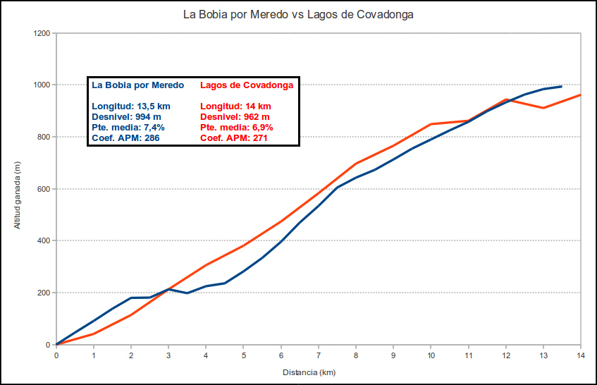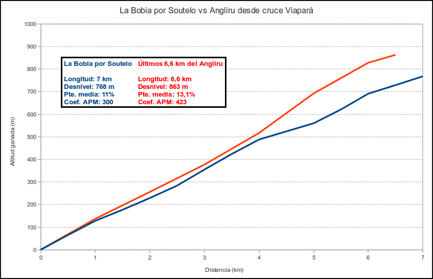 Como acostumbramos, para que se vean mejor las características y dureza de La Bobia, tanto por Meredo como por Soutelo y Penzol, nada mejor que comparar su altigrafía con otros puertos muy conocidos. Los perfiles de La Bobia van en azul y en rojo la comparativa.