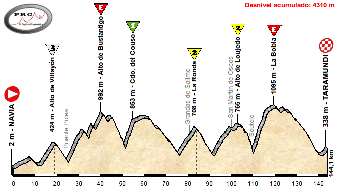 Con salida en Navia tiene lugar esta etapa que busca juntar los dos grandes puertos del occidente astur: La Marta y La Bobia, siendo ambos Especiales de paso. Pero la primera dificultad es el Alto de Villayón, que con 4 km al 6,5% supone el inicio de un serrucho asombroso. Tras su bajada comienzan las grandes rampas de La Marta, aunque en esta ocasión se asciende «solo» hasta el Alto de Bustantigo, precisamente lo más exigente del puerto. Aunque tenga dos tramos de descenso, las subidas están siempre en torno al 9%, con rampas de hasta el 18%, un puerto muy duro y traicionero. Su veloz bajada da paso a las rampas del Collado de Couso … ¡y de que forma!: su primer kilómetro es al 13% y totaliza 5,5 km al 9% antes de desembocar en la carretera del Puerto del Palo.