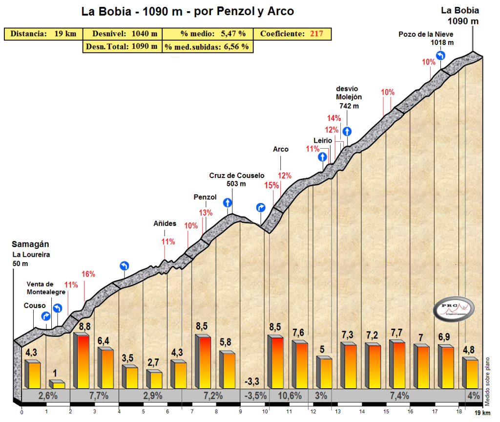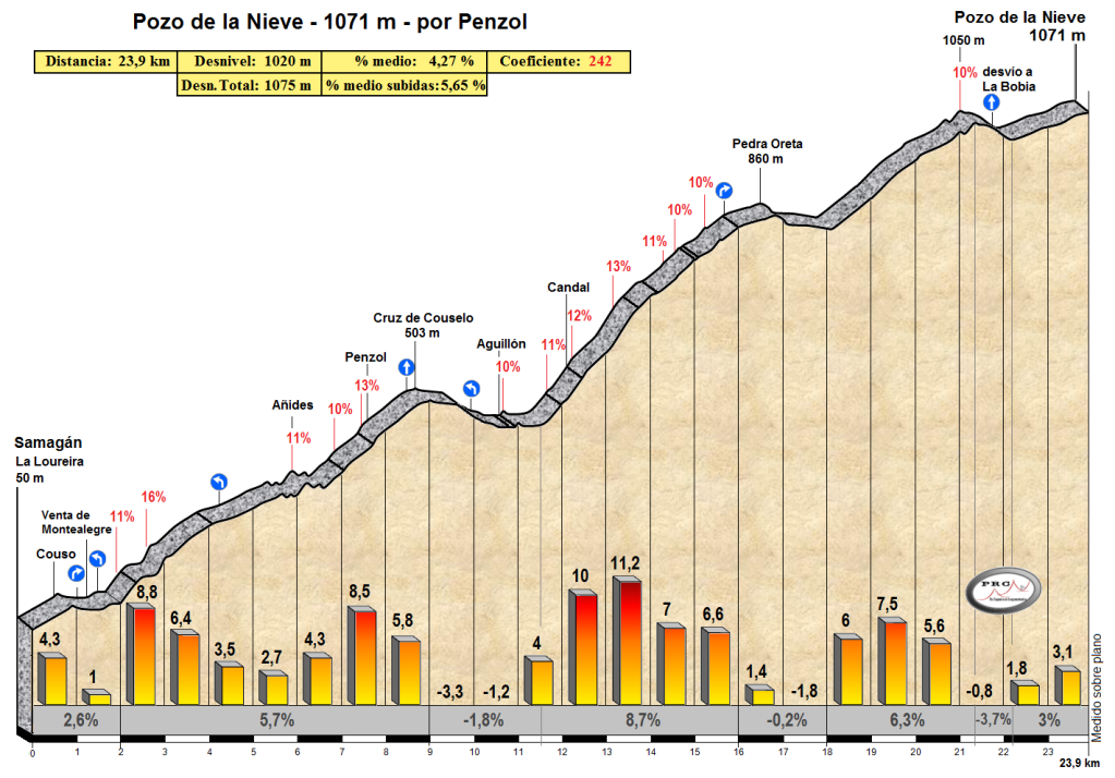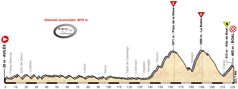 En primer lugar se asciende al Pozo de la Nieve por Penzol, una subida larga, de 1075 m de desnivel total, que alterna zonas muy duras con llanos o bajaditas, que debido a estas características puede cumplir muy bien la doble función de desgaste a la vez que elimina a muchos corredores del grupo. Se desciende entonces por La Garganta al arroyo Brañais de cara al punto más caliente del día. Los 7,7 km al 9,1% de este puerto ya suenan como números respetables, pero lo que más asusta son esos 2 kilómetros al 13,5% de la parte central. Se baja de La Bobia hacia Doiras y la resolución de la etapa llega con la tendida ascensión hasta Boal, de 8,1 km al 4,7%.