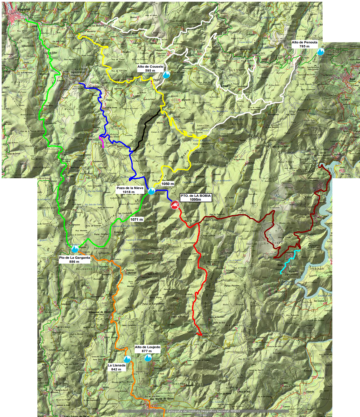 Un punto clave en este mapa es el Pozo de la Nieve, donde confluyen las carreteras de Molejón, La Garganta, el NW y la que lleva a La Bobia. Aunque lo hemos marcado como puerto, subiendo por él no es nunca el punto más alto. Si se llega por la vertiente azul de Meredo y Molejón, se tome el camino que se tome se ganan todavía algunos metros de altitud, ya sea para coronar La Bobia, ir hacia La Garganta o hacia el noroeste. Otro punto a tener en cuenta es que los cruces de carreteras del Pozo están separados por algunos metros, por lo que se puede hacer bucles sin que existan cruces ni problemas logísticos: tal es el caso de los recorridos de las etapas 5 y 8.