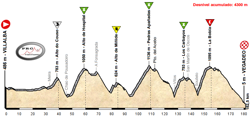 Volvemos a salir de Galicia, en este caso de Villalba, para poner dirección Asturias y encontrar en el camino otro tremendo encadenado de puertos diferentes al resto de etapas. Hasta llegar a Meira no existen dificultades, pero ahí empieza «el baile» con el Alto de Couso (5,8 km al 5,1%), cuya bajada es mucho más pronunciada. Desde Chao de Pousadoiro se encara el duro Alto del Hospital, con 10 km al 7,6% y 200 APM (incluyendo un tramo de 4,5 km al 10%). Tras coronar se crestea hasta Fonsagrada y se baja hacia el Alto de Miñide, por donde pasó la etapa de La Cobertoria de La Vuelta 2006. Es un puerto corto pero con rampas muy duras, como sus 2,3 km iniciales al 8,8%.