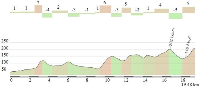 La última oportunidad para ver cambios en la general (salvo gran sorpresa en la jornada final), con una etapa corta pero que incluye 3 pasos por Bousher Alamrat en los últimos 45 km: 2 de ellos por la vertiente sureste (el 1º y el último), con un tramo de 2,5 km al 9 % antes de coronar un primer altillo; y uno por la dura cara noroeste, ya subida en la 2ª etapa y que cuenta con 3,5 km cercanos al 10 % de media. Desde la última subida a meta restarán 12 km, los últimos 4 completamente llanos.