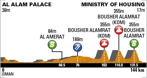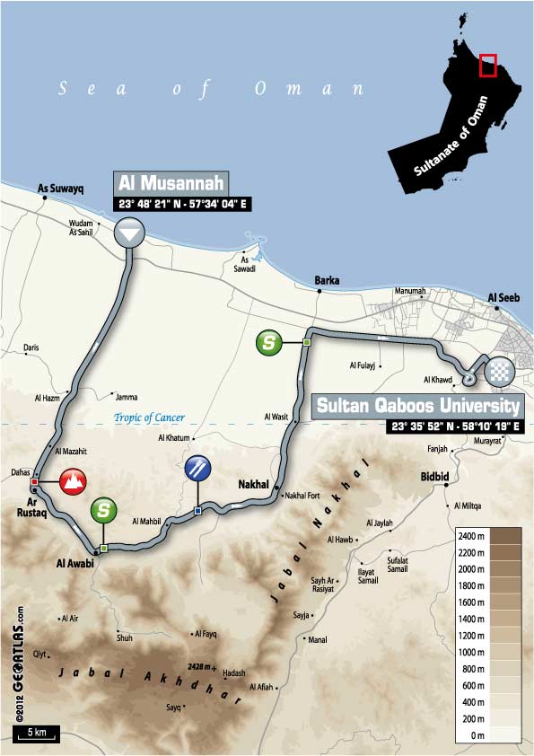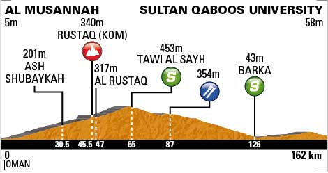 La prueba se inicia con una etapa básicamente llana entre Al Mussanah y Sultan Qaboos, si bien los primeros 65 km «pican» ligeramente hacia arriba, incluyendo el repecho de Rustaq (marcado como puerto, aunque no deja de ser una subida muy modesta), y los siguientes 60 son de suave descenso de vuelta a la zona costera.