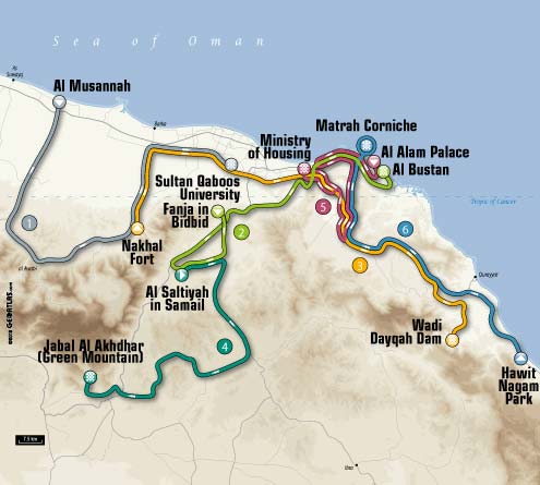 A nivel de recorridos la prueba ha tenido una evolución sorprendente, pasando de una 1ª edición totalmente favorable a los rodadores, con etapas llanas y una crono individual como jornada reina, a una 2ª edición mucho más selectiva, donde aparte de endurecerse el trazado de la crono se estrenaba un final en alto muy exigente, Green Mountain (Jabal Al Akhdhar), con largos tramos por encima del 13% y entrando en la lista de km más duros en competición. En 2012 repitió la subida la subida a Green Mountain pero se elimino la contrarreloj, además de haber 2 etapas con una parte final rompepiernas, siendo un trazado más favorable para los escaladores.