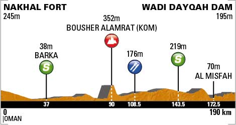 La 3ª etapa es la más larga de toda la prueba, con 190 km de recorrido entre Nakhal Fort y la presa de Wadi Dayqah. A priori las mayores dificultades serán Bousher Alamrat, con alrededor de 3,5 km al 9-10 % aunque situado muy lejos de meta; y el terreno quebrado entre las cercanías de Al Misfah y la llegada: 17,5 km finales plagados de repechos, el último de ellos de subida a la presa, ya en el km de meta, siendo un final muy propicio para los «up-hill finishers».
